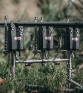 Designed, developed & machined here in the UK using Marine Grade 316 Stainless Steel. Supplied with two middle fixings, one for a two rod & another for a three rod set up. Extremely compact when closed for easy storage, the Front & Rear size will pack down in to one of our 2 Rod Buzz Bar Bags, even with three alarms attached!
