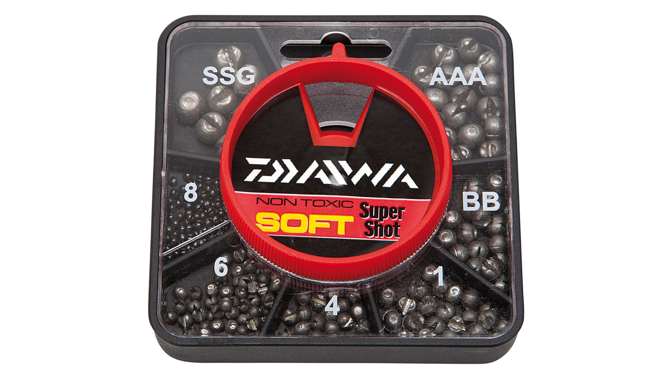 Daiwa Soft Super Shot, Developed by Dinsmores this collection of non toxic split shot is remarkably soft. Requiring only finger pressure to close, each shot also features a location divot guiding your fingernail to assist opening. Designed to slide easily on the line.