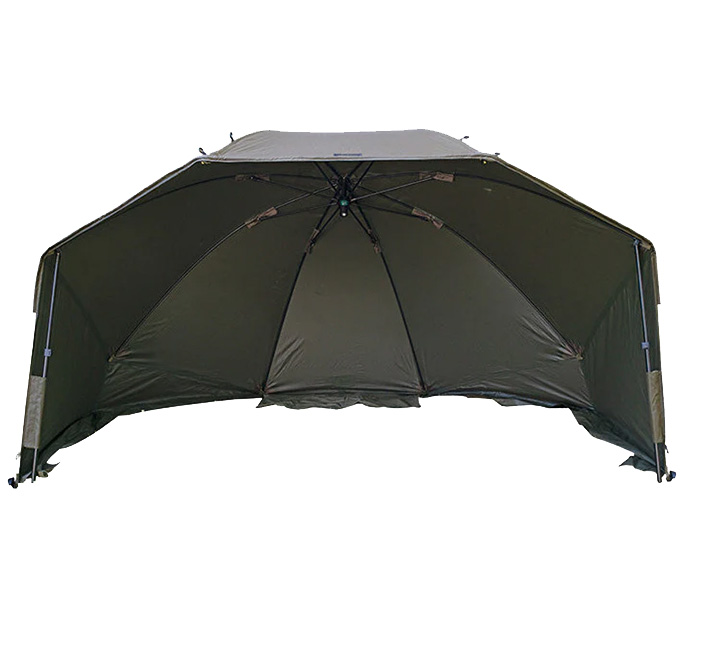 The brollys feature a dark olive green 210d cover with 5,000mm hydrostatic head. The inner surface has a lightproof laminate to minimize sunlight ingress. The frame is made from ultra strong and sturdy 8.5mm fibreglass ribs and features a space saving locking mechanism which maximises headroom even when the brolly is set low. Three pegging points on the storm sides allow the brolly to be set at different heights depending on the angler’s preference, uneven ground and inclement weather.