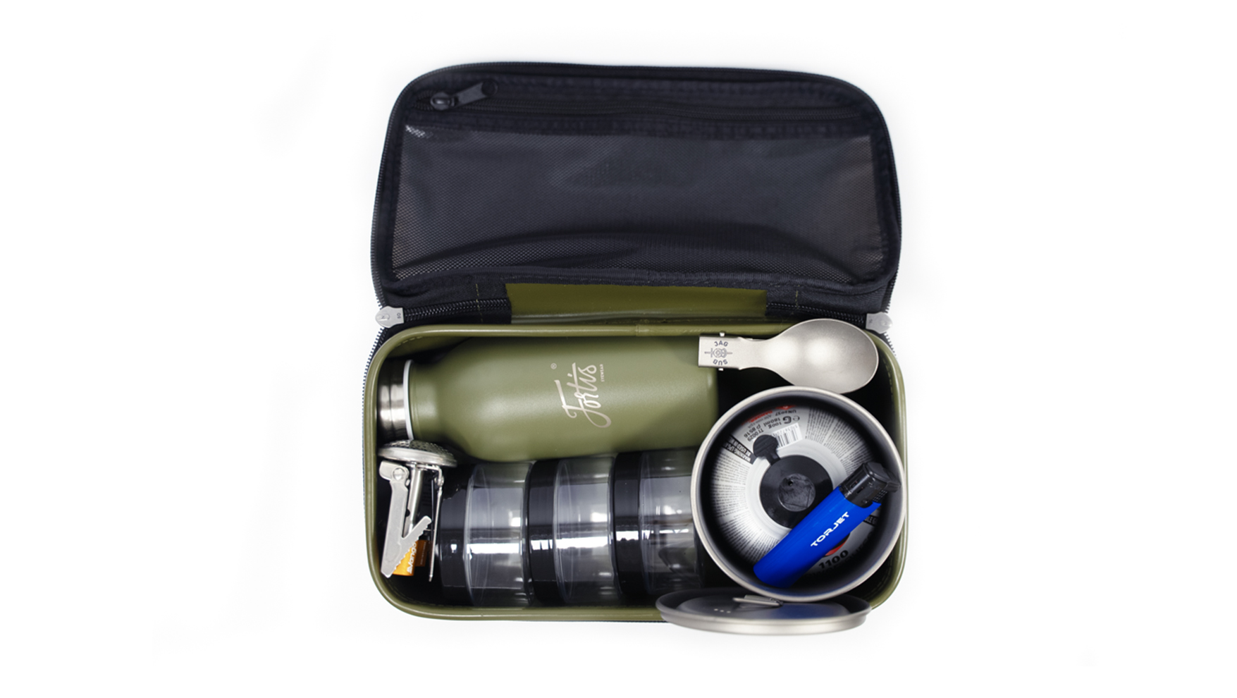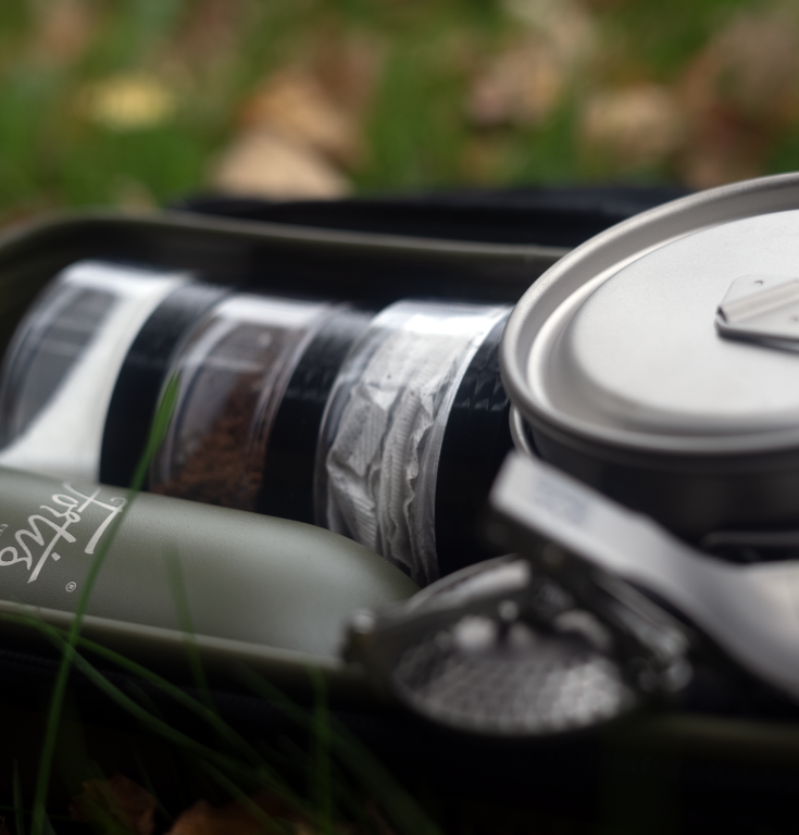 The kit is made up using our incredible SUB x JAG titanium cup and folding spoon, the market leading Fotris Recce mini milk bottle, 100g gas bottle and brew accessories (50ml pots and Jet lighter) all in the hardwearing Korda EVA waterproof compac case.