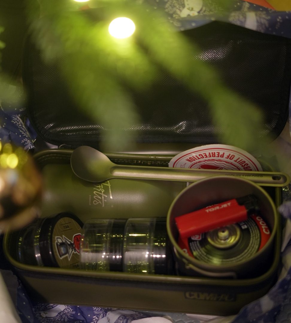 Windproof Jet Lighter, Prolite Explorer 50mm Pots for Tea, Coffee & Sugar, a 100g Gas Bottle that fits perfectly in the kit.
